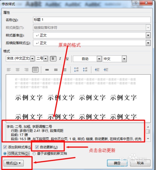 在弹出的菜单里头,你可以看到该标题原来的格式。为了方便你修改后的标题及时更新,点击“自动更新”。下一步就是点击“格式”,进行详细修改格式。如图所示。