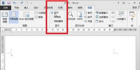 第2步,在打开的“视图”功能区中,选中“显示”区域中的“标尺”复选框。则Word 2013页面将显示出标尺,如图所示。