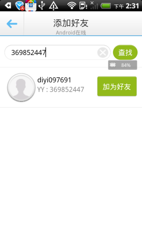 4、进入“添加好友”界面后就会提示你输入yy号查找接着点击添加好友,等待好友确认后就完成了。