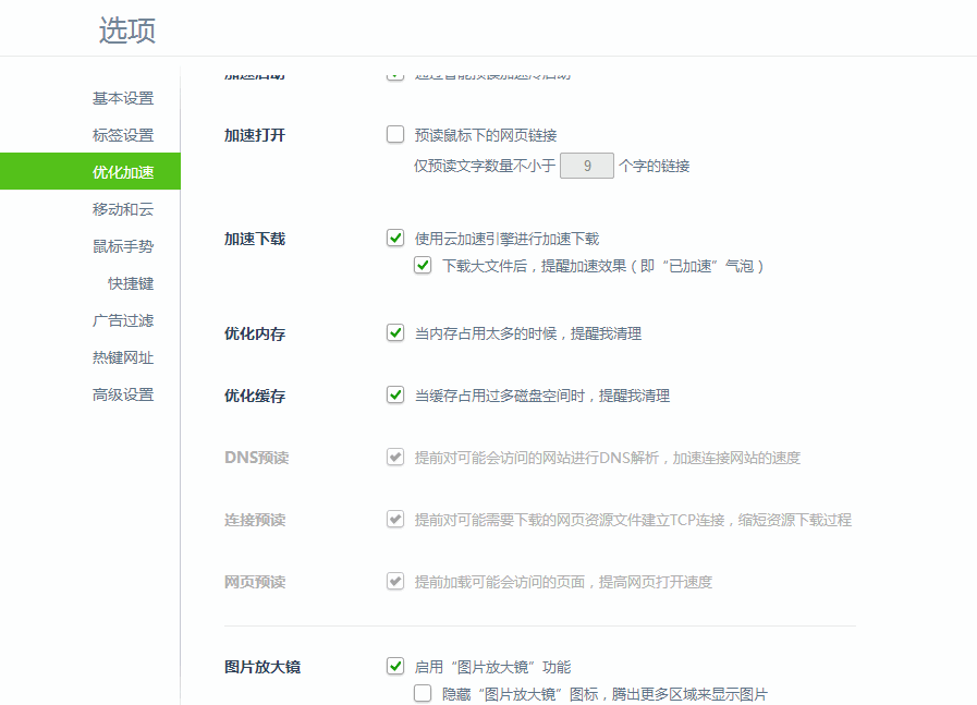 打开工具,然后选择优化加速。最后一项的图片放大镜功能勾掉即可。