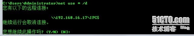 在该命令提示符下输入该命令后,会显示目前所有的远程连接,并提示师傅取消这些连接,输入Y即可取消连接,同时登陆共享文件夹时用的账号和密码也会被清空。