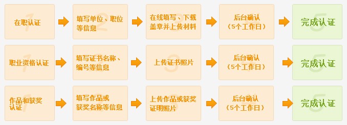 用户可上传在职证明、职业资格证书、作品和获奖证明进行认证;