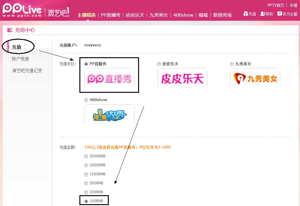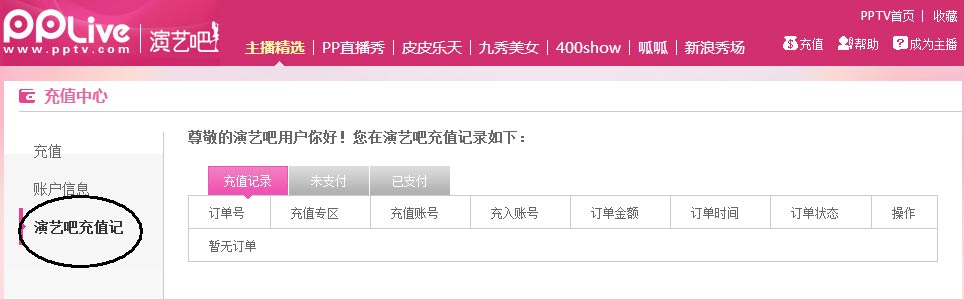 1、从PPlive演艺吧首页,一级导航栏【充值】进入;