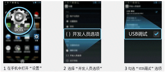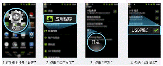 2、点击菜单键并选择“设置”→选择“应用程序”→选择“开发”→打开“USB调试”开关,如下图所示:
