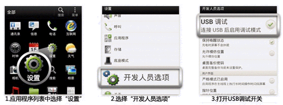 5、在应用列表中选择“设置“→选择”应用程序“→选择”开发“→打开”USB调试“开关,如下图所示: