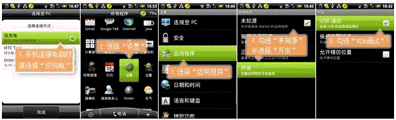 7、手机连接电脑时请选择“仅充电“连接方式→在所有程序列表中选择”设置“→勾选”未知源“并选择”开发“→打开”USB调试“开关,如下图所示: