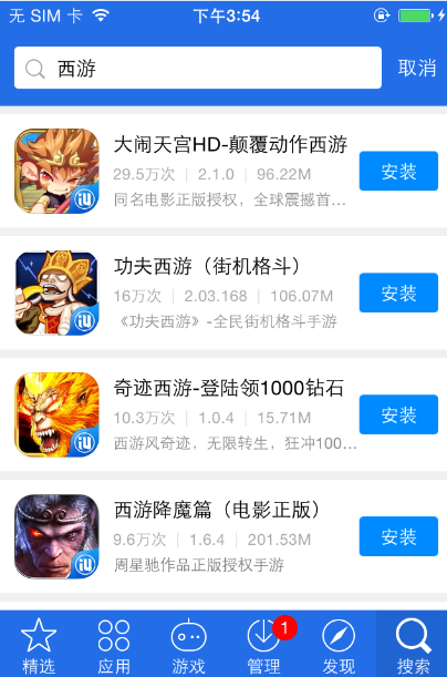 3、输入您想要搜索的内容的关键字,比如“西游”,在我们的游戏软件列表里面就可以搜索到所有和“西游”有关的游戏或应用;