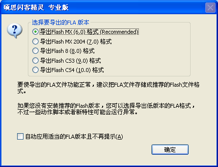 在swf转fla时,会出现一个挑选要导出的 FLA版本,此时,依据须要挑选,“确定”即可。