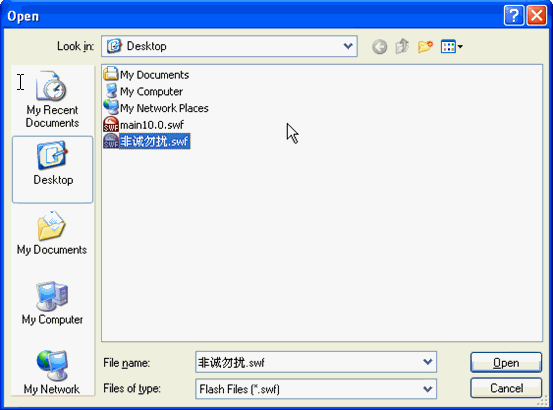 翻开闪客精灵软件,点“高速翻开”按扭进入文件挑选列表,在翻开的对话框中挑选您所须要修主体字的SWF文件,比如我们挑选一个名为“非诚勿扰” 的SWF文件: