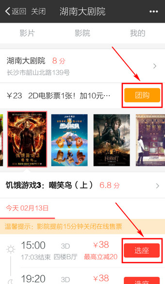 6.以《饥饿游戏》为例进入,选择一家电影院