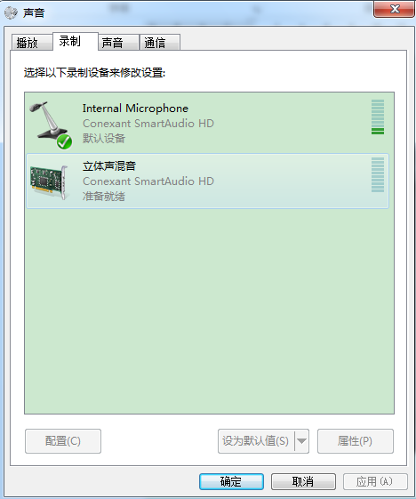 1、右击桌面左下角小喇叭---录音设备,确保internal microphone开启(如未开启:鼠标放在蓝色区域内---单击鼠标右键---勾选“显示禁用设备”---开启internal microphone)