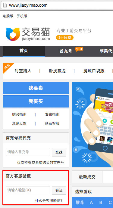 2、交易猫所有客服的QQ号码均可在交易猫首页“官方客服验证”进行验证,当有人自称是交易猫客服时,请您先去交易猫官网首页即可进行验证。