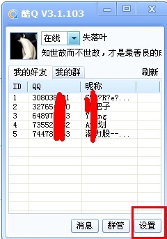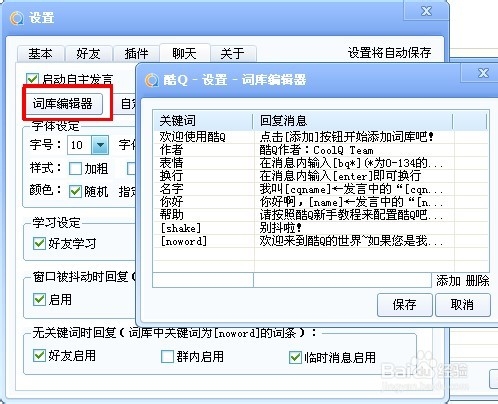 设置词库,这点很重要,你的机器人的智能程度全靠词库了。默认的只有几句话,你可以自己添加或者去论坛下载词库。http://c.cqp.cc/b-37-1