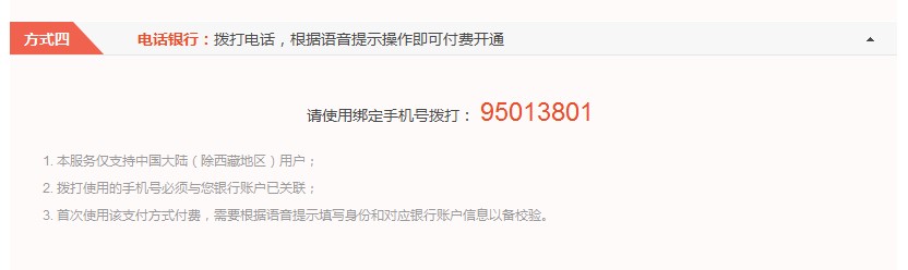 此方式支持除西藏以外的任何地区,同时绑定手机需与银行帐户相关联,如果未关联银行帐户,按照电话提示中操作即可。