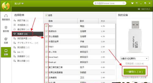 大家根据自己的需求,选择需要下载的歌曲,当然小编需要全部下载的,勾选全选即可。看到最右边有个“一键导入”按钮,点击即可。剩下的就交给QQ音乐播放器完成即可。