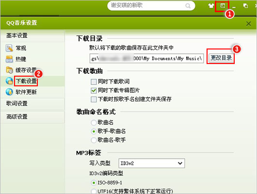 二、下载歌曲时无法快捷修改保存路径,若需修改下载歌曲的保存文件夹,建议进入播放器页面右上角“主菜单=》设置=》下载设置=》下载目录”里修改。