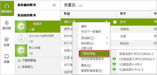 一、右击需下载的歌曲名称即有“下载到电脑”,可快捷选择下载该歌曲的音质(普通用户可下载标准音质,绿钻用户可下载HQ高品质或无损音质)。