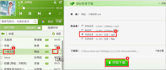 二、点击下载按钮后跳转到下载歌曲页面。若该歌曲提供了SQ无损或HQ高品质音质,仅绿钻用户可以下载,普通用户支持下载标准音质;设置下载歌曲的保存路径即可“开始下载”。