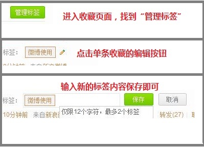 进入“我的收藏” 点击“管理标签”即可对现有的标签进行修改和删除操作,删除标签时不会删除相应的微博,只是将该标签去掉。