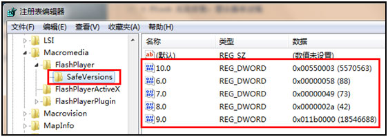 2、将 "HKEY_LOCAL_MACHINE\SOFTWARE\Macromedia\FlashPlayer\SafeVersions" 内的值删除(保留默认值)如下图所示。
