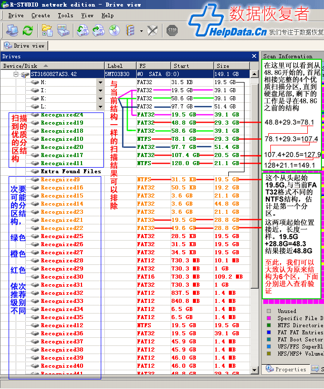 我们首先排除那些与当前结构一样的扫描结果,排除后,我们分析剩余的分区结构,从最高推荐等级绿色项中,可以看到从48.8G开始的,首尾相接完整的4个优质扫描分区,分别是 48.8+29.3=78.1、78.1+29.3=107.4、107.4+20.5=127.9、128+21.1=149.1,直到硬盘尾部。这样完全可以确认这是故障硬盘没有被分区格式化安装系统之前的结构,即硬盘的后4个分区。