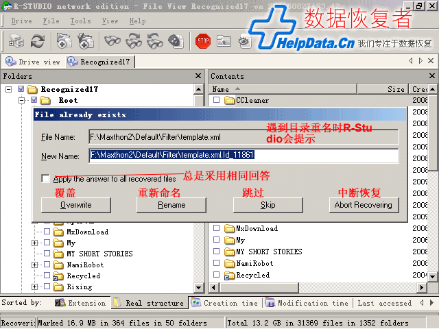 遇到目录重名时R-Studio会提示,有覆盖、重新命名、跳过、中断恢复几个选项。勾选总是采用相同回答后,相同问题将不再提示。