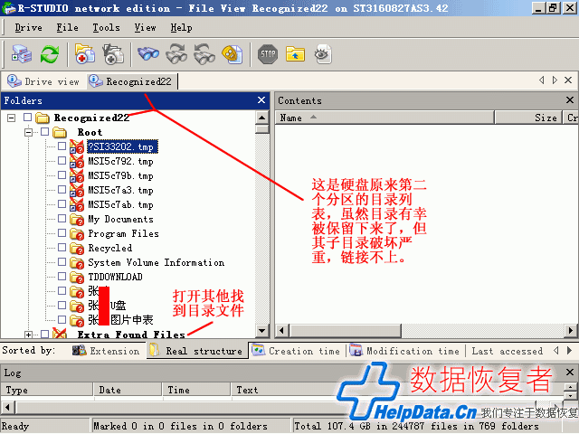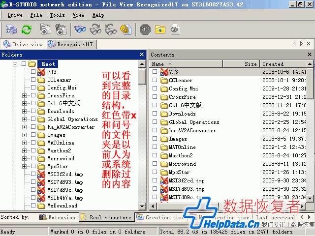 R-Studio目录列表中可以看到完整的文件夹结构,红色带x和问号的文件夹是以前人为或系统删除过的内容。
