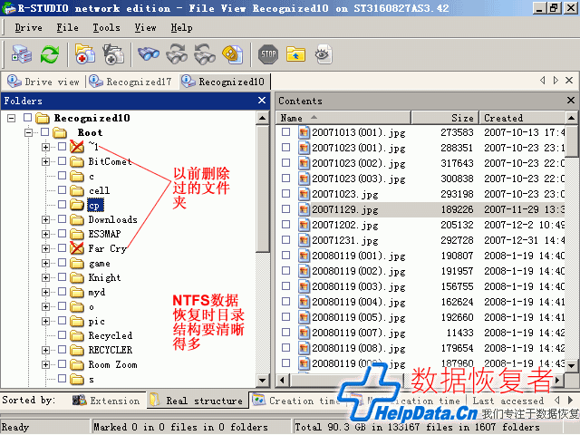 在R-Studio的目录列表中,也显示有以前删除过的文件夹,相对于FAT32,NTFS分区数据恢复时目录结构要清晰得多。