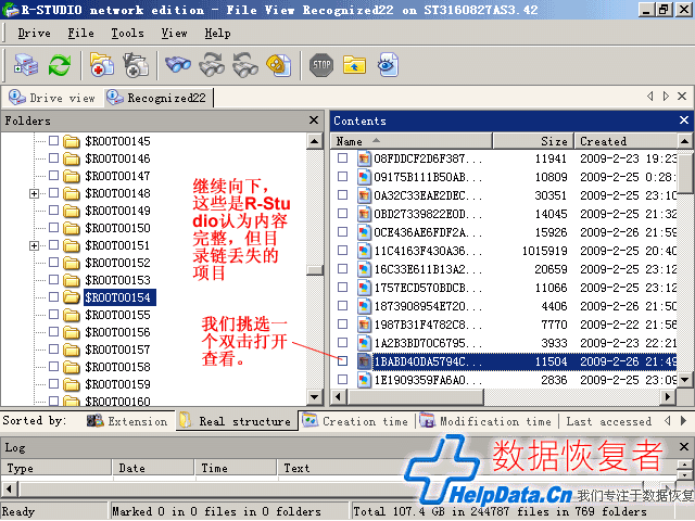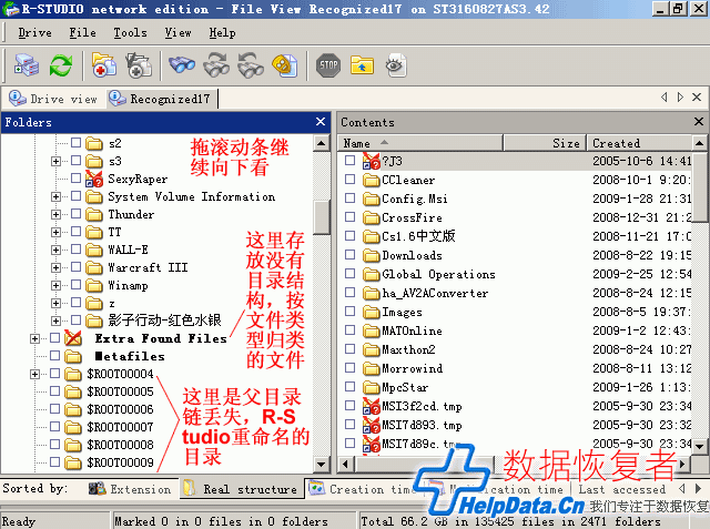 拖滚动条继续向下看,R-Studio命名的Extra Found Files 文件夹里存放的是没有目录结构、按文件类型归类的文件。再下面是父目录链丢失,R-Studio重命名的目录$ROOT0000n....。