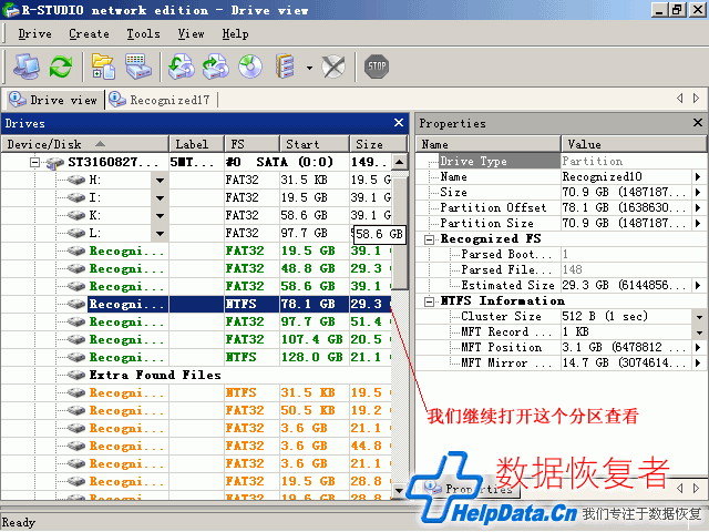 这是R-Studio扫描到的分区结构,分区大小、起始位置、文件系统等信息都分列出来。根据每个分区的完整度,R-Studio分开显示不同的推荐级别,用绿色、橙色、红色表示,依次推荐级别不同。