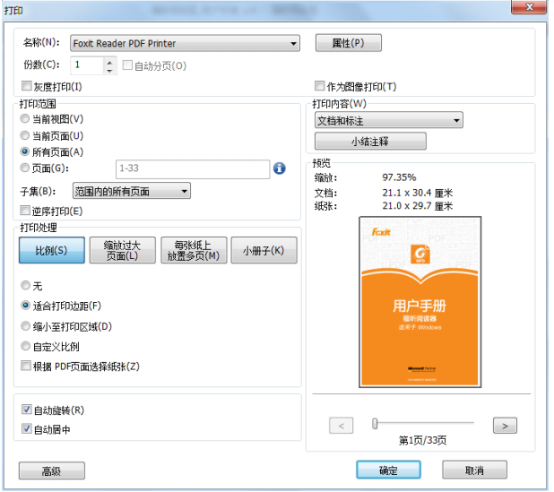 单击“文件”菜单,选择“打印”。在弹出的打印对话框中选择“Foxit Reader PDF Printer”作为虚拟打印机(见下图):