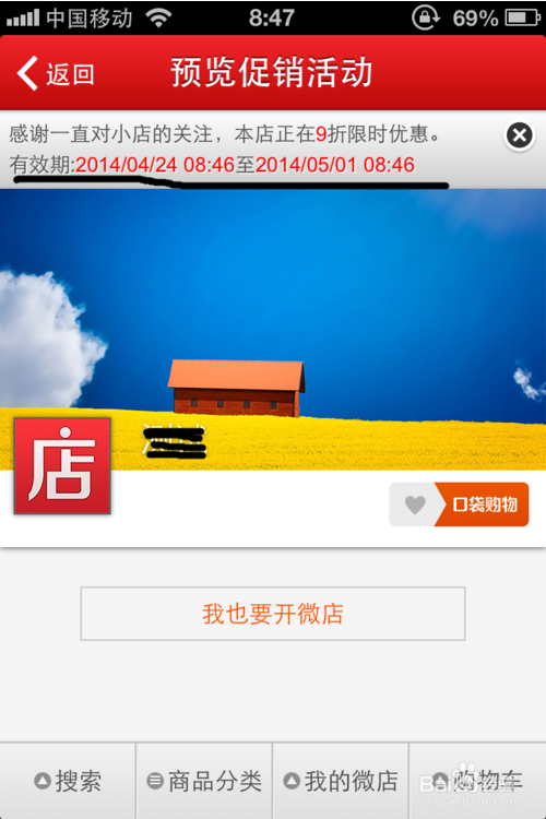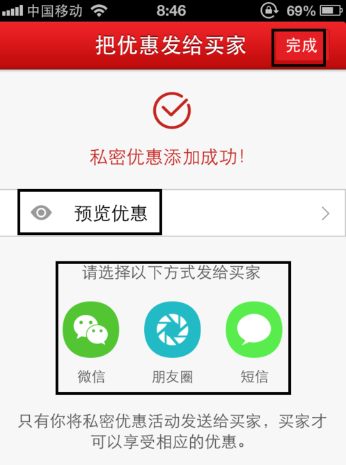 最后设置完成,促销生效,你可以转发到朋友圈。同时也可以预览促销情况。