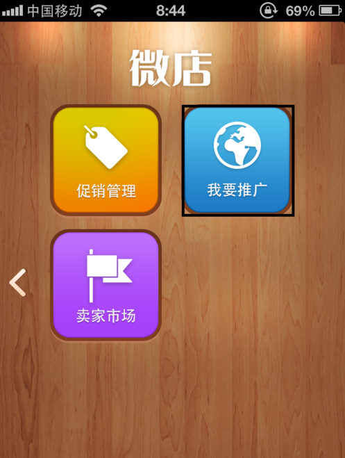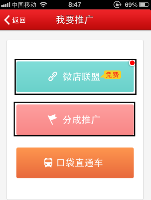 微店开通后,你就有了属于自己的店铺,第一件事情就是添加商品,这里就不多说了,在怎么开微店里已经说过了。商品上架了,如何推广呢?点击进入主页面第二页的我要推广,推广方式有三种,微店联盟和分成推广都可以用,口袋直通车有要求限制。先说微店联盟,点击进入微店联盟。