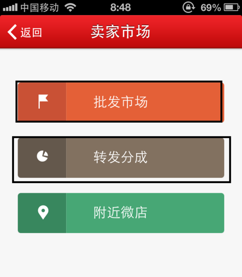 主页面第二页还有卖家市场,里面分为批发市场、转发分成和附近微店,在批发市场里可以进货,货源不足的店主可以看看。转发分成就是你转发了别人的商品,商品卖出后你得到佣金,其实也就是分成推广,如果店铺没有商品,那么可以通过转发分成来盈利。附近微店是手机开启定位后显示附近有那些微店。