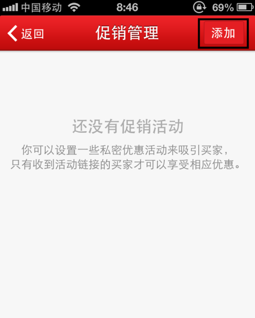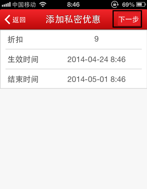 最后说主页面第二页的促销管理,点击进入,添加要进行促销的商品,然后是促销折扣和促销时间段。