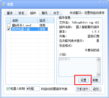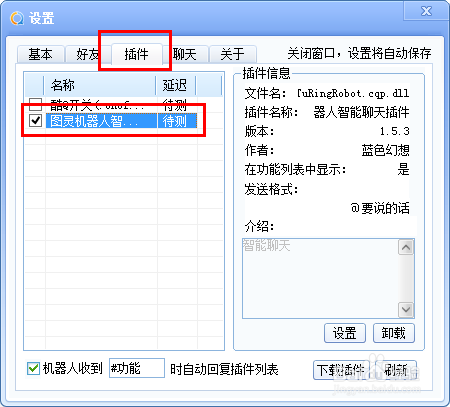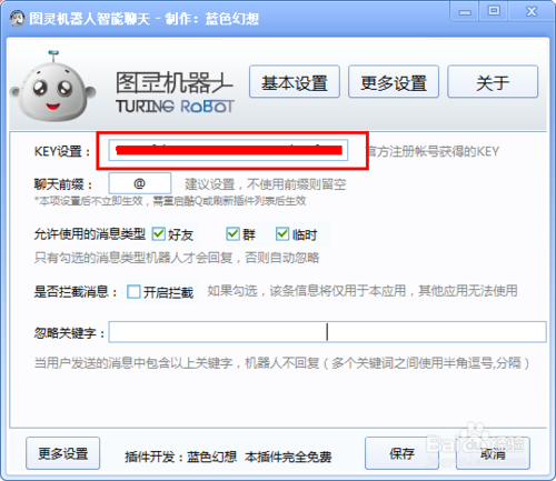 进入设置,插件,勾选图灵机器人插件,右下角设置进入插件设置,在弹出的窗口中能看到apikey的输入框,从官网上把自己申请到的apikey粘贴进去。然后刷新插件!