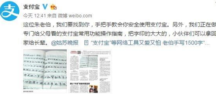 对此,支付宝在两周前表示:我们正在做专门给父母看的支付宝常用功能操作指南,把字印的大大的,小伙伴们可以拿回家给长辈。