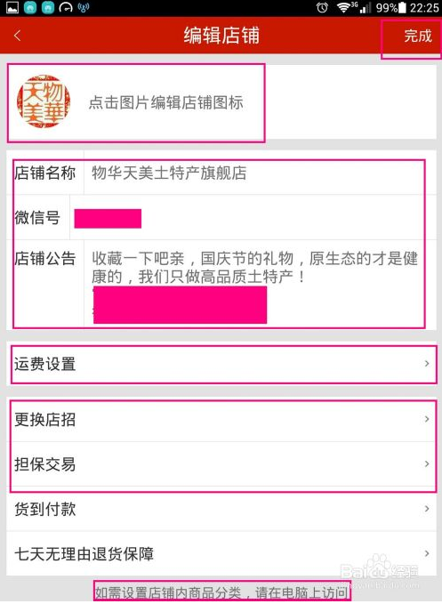 2、根据自己的情况设置店铺名称、店铺公告、微信号