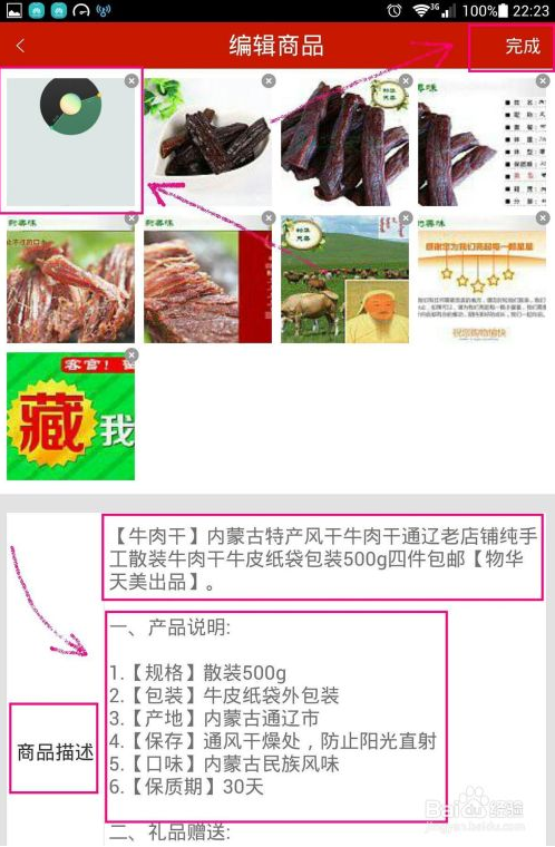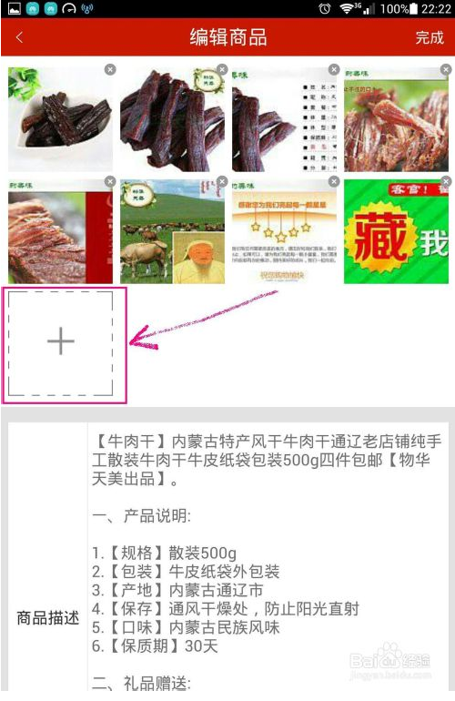 一直拖动上传完成的图片,可以更换位置,图片上传完成后,开始编辑“商品描述”。