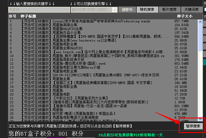 5.等待搜索结果加入列表框,搜索到资源后,也可以暂停继续搜索,节省宽带,提交软件工作效率