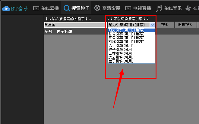 3.选择搜索引擎,BT盒子汇聚9大搜索引擎,资源甚是丰富;