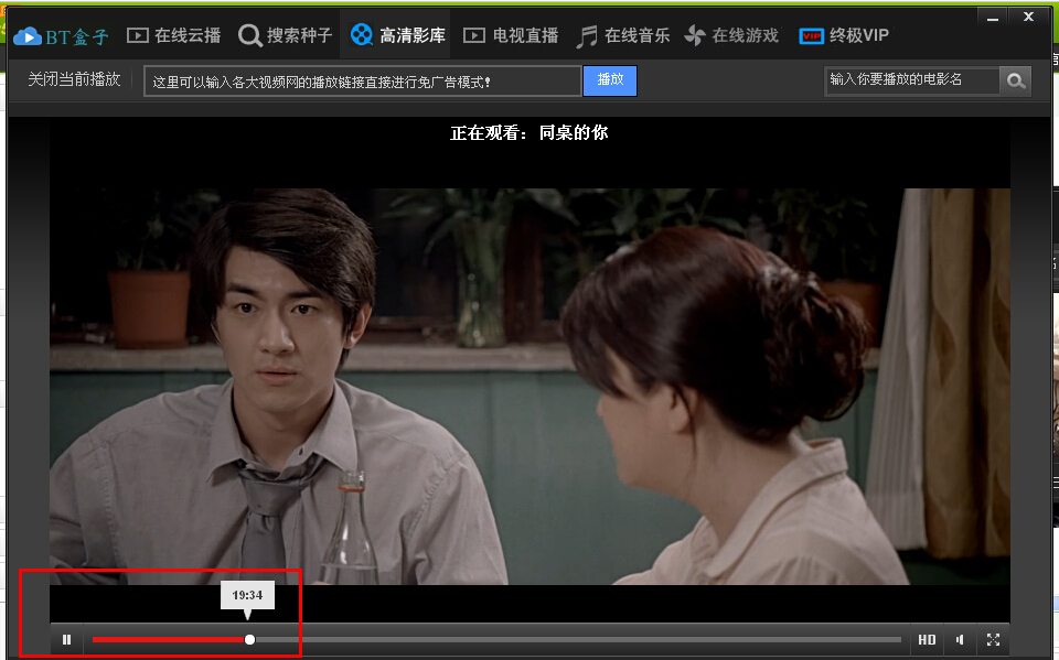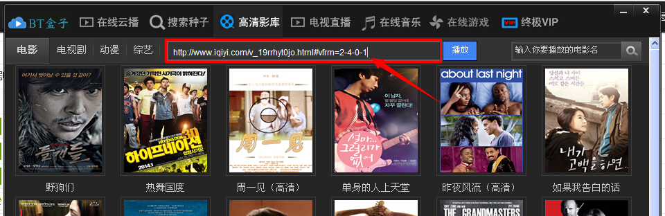 3、打开BT盒子,进入高清影库,将复制好的视频播放地址使用快捷键Ctrl+V粘贴到BT盒子的播放地址输入框内;