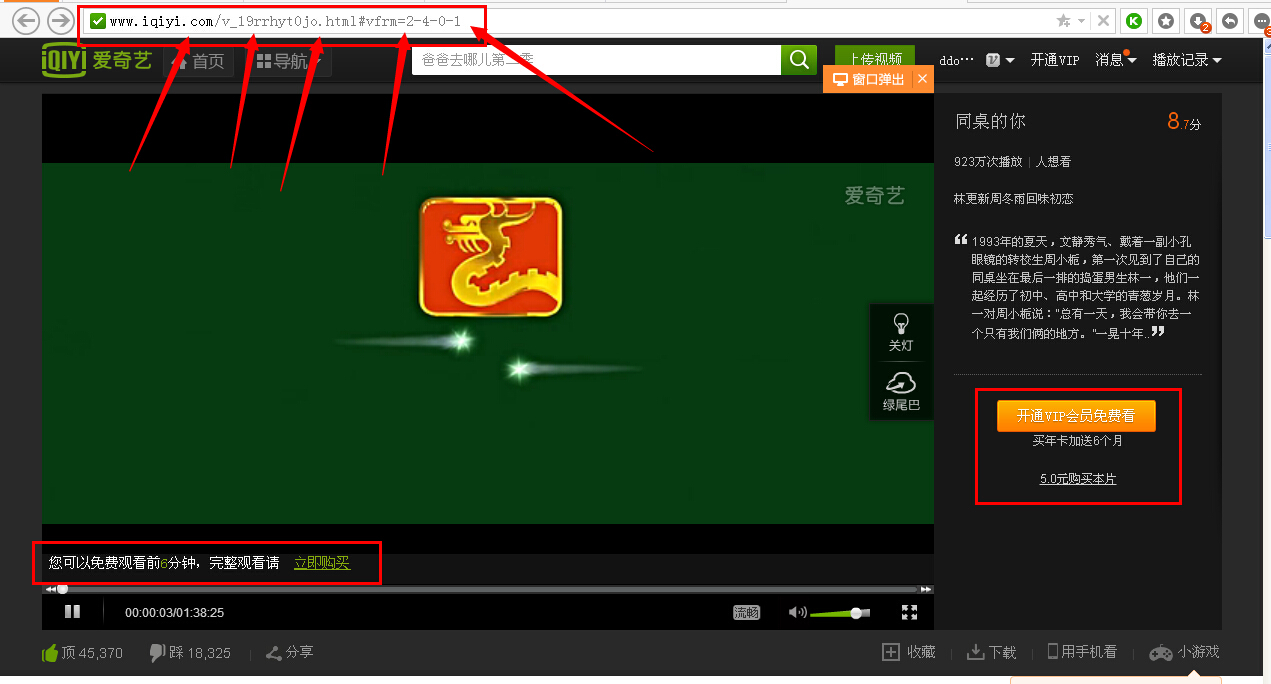 4、点击“播放”按钮,就会开始播放,从上图可以看到,同桌的你这部VIP视频已经突破了爱奇艺的受限时间。