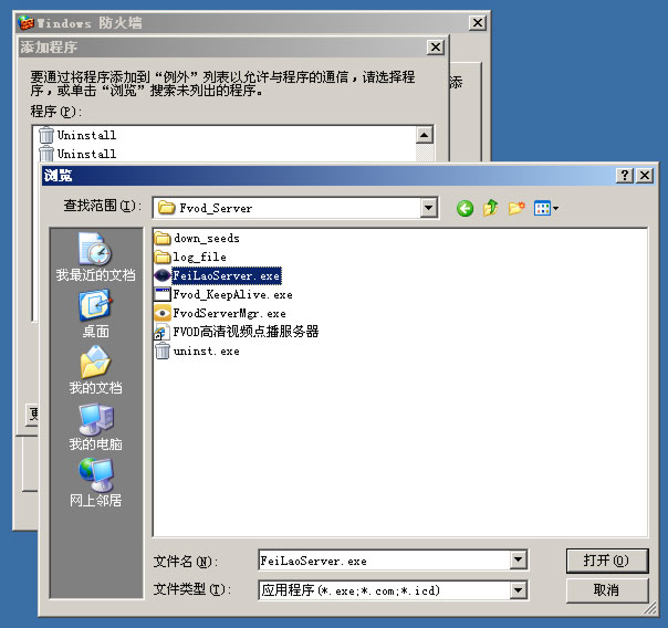 控制面板 => Windows 防火墙 => 例外 选项卡,将FeiLaoServer.exe添加到例外程序中