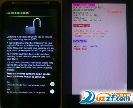 4、此时手机会弹出一个解锁界面,按上音量按键选择YES,点电源按键确认,重启后即完成解锁。