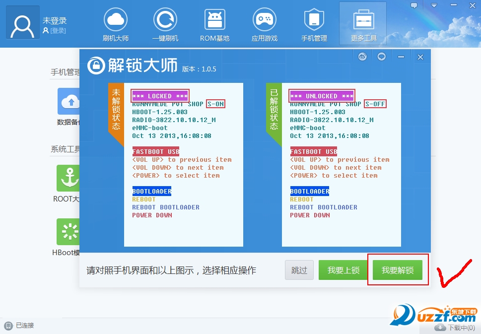 3、手机重启进入HBOOT,出现如下图的界面,点击【我要解锁】,刷机大师会自动帮您解锁,请按提示操作耐心等待。