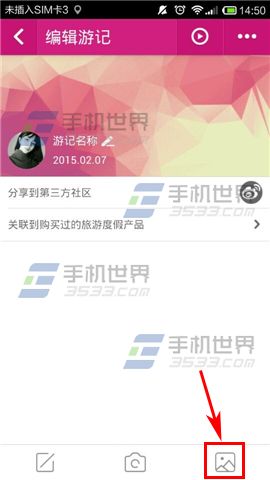 2)跳转至游记页面,点击右上方的第一个按钮【+】,进入到编辑游记模式,点击右下方的【图片】按钮,进入本地相册添选择一张图片添加,也可以现场拍一张哦。(如下图)