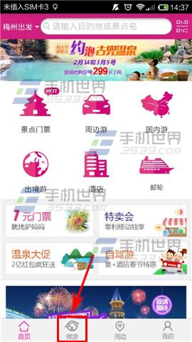 1)打开【驴妈妈旅游】,进入首页后,点击下方的【微游】按钮。(如下图)