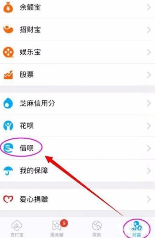 1、首先进入支付宝钱包主界面,然后切换到【财富】按钮,在其页面的下方找到【借呗】,如下图所示:
