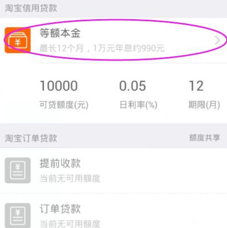 2、然后进去到淘宝信用贷款页面,在其页面点击【等额本金】,如下图所示: